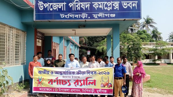 টঙ্গীবাড়ী প্রতিনিধি: জাতীয় ও আন্তর্জাতিক ক্রীড়া দিবস উপলক্ষে মুন্সীগঞ্জের টঙ্গীবাড়ীতে বর্ণাঢ্য র্যালি অনুষ্ঠিত হয়েছে। সোমবার (৬ এপ্রিল) সকাল ৯ টায় উপজেলা প্রশাসনের উদ্যোগে এ কর্মসূচির আয়োজন করা হয়। উপজেলা সহকারী কমিশনার (ভূমি) মো. ওয়াজেদ ওয়াসীফ এর নেতৃত্বে একটি বর্ণাঢ্য র্যালি বের করা হয়। র্যালিটি উপজেলা পরিষদ প্রাঙ্গণ থেকে শুরু হয়ে উপজেলার প্রধান প্রধান সড়ক প্রদক্ষিণ করে পুনরায় একই স্থানে এসে শেষ হয়। র্যালিতে অংশগ্রহণকারীরা ক্রীড়ার গুরুত্ব তুলে ধরেন।