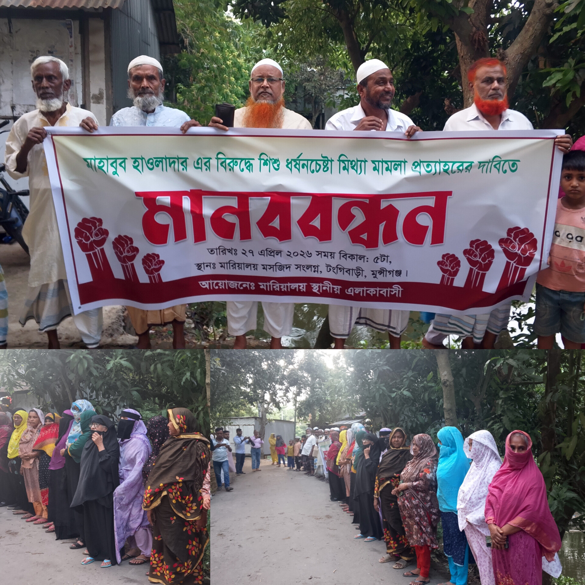সোমবার (২৭ এপ্রিল) বিকেল ৫টায় উপজেলার মারিয়ালয় গ্রামে শতাধিক নারী-পুরুষের অংশগ্রহণে এ মানববন্ধন অনুষ্ঠিত হয়।